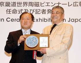 「韓国陶磁器および2007第4回京畿道世界陶磁ビエンナーレ」の広報親善大使に就任した、俳優の中尾彬さんの任命式と会見が1日、東京の新宿パークタワーで行われた。