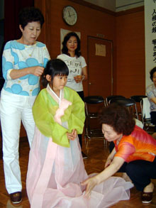 婦人会はこの日のため数十着のチマ・チョゴリを持参した。試着に子どもたちばかりか母親たちまで大喜び。「テレビで見たことはあるけれど、実際に袖を通すのは初めて」という父母から「うわーきれい」と感嘆の声が上がった。なかには携帯電話の待ち受け画面にしようと、子どもに撮影を頼む光景も見られた。このほか、韓国料理と会話も指導したが、いずれも好評だった。