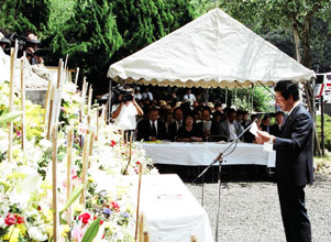 全員で黙祷後、主催団体「浮島丸殉難者を追悼する会」を代表して余江勝彦会長が「野田幹夫前会長の遺志を引き継ぎ、平和への運動の発展に尽くしたい」と犠牲者の冥福を祈った。続いて民団舞鶴支部の金榮吉支団長が追悼辞を述べ、京都朝鮮中高級学校の生徒たちが、追悼歌「はまなすの花 咲きこめて」を合唱した。この後、参加者400人全員が海に献花し合掌した。