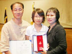 [ 両親と受賞を喜ぶ華卿さん(中央) ]