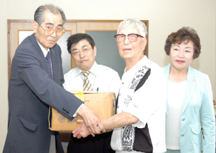 [ 慰問品を手渡す李忠征団長(左) ]
