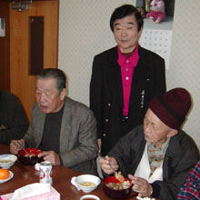 [ 食事の席でお年寄りを激励する呉龍浩さん(中央) ]