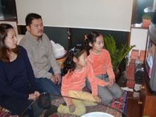 [ 両親と一緒に韓国の児童教育用ビデオを見る姉妹 ]