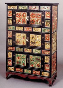 華角は韓国独自の工芸品で、牛の角を加工して透明の角紙を作り、それに絵画や彩色を施して木質工芸に貼り付けて装飾したもの。