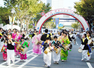 農楽隊は堺市立少林寺小学校民族学級で学ぶオリニと教師、卒業生らで構成、白頭学院と金剛学園の生徒が多数加わった「朝鮮通信使」パレードを先導した。総勢230人で、昨年より規模が大きくなった。女子生徒は「チャングム」のテーマ曲に合わせ華麗な扇の舞を披露した。