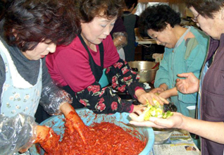 この日は18人が参加。韓さんがあらかじめ下ごしらえしておいた白菜60株を手を真っ赤にしながら漬け込んだ。名古屋から参加した主婦は「交通費やらなにゃら大変割高なキムチになりますが、わいわいがやがやみんなでつくるキムチは最高の味」と話していた。