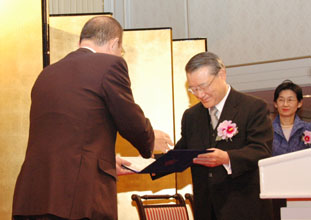 [ 鄭団長から感謝状を贈られる羅大使 ]