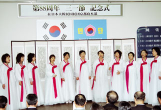 大阪本部の式典には500人が出席。金漢翊団長はあいさつで「今年は朝鮮通信使400周年。地域との共生に向け、地方参政権獲得にまい進していく」とあらためて決意を表明した。