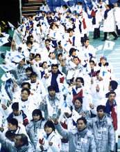 韓半島旗で同時入場 第5回青森冬季アジア大会開幕(03.02.05)