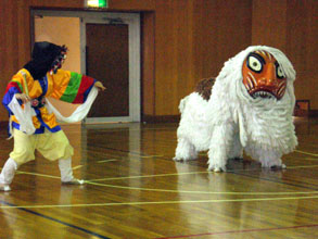 [ 仮面劇の練習風景。演じているのは高校生の伝統芸術部員(白頭学院体育館) ]