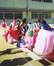 この日は小学生全員が色とりどりの民族衣装で姜校長に新年の歳拝を行い、文房具などの入ったお年玉を受け取った。 この後、ペンイ、ユンノリ、チェギチャギ、ノルティギなど韓国伝統の正月遊戯を楽しんだ。遊びの輪には大阪市立梅南小学校と松之宮小学校からも3年生児童が加わって歓声をあげていた。