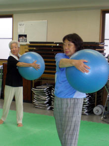 まず、16ビートの軽快な音楽に合わせて柔軟体操。続いて大きなボールの上に座って腰をひねったり、まわしたり。さらに、ボールを投げたり、転がしたりとかなりの運動量だ。参加のお年寄りたちは「楽しく、体の調子がいい」「汗をかくことは新陳代謝にもなる」と笑顔で語った。