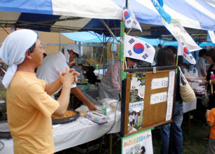 同支部は太極旗の小旗をはためかせ、ホルモン焼きとトッポギを販売。「おいしいよー」「よっていってやー」と元気に声をかけていた。売れ行きも上々だった。