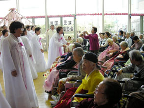 清楚なチョゴリ姿の婦人会兵庫の会員は、美しいコーラスで「兄さんへの思い」や「アリラン」など4曲を歌った。歌が始まると、車いすのお年寄りたちも踊りたいのか、不自由な体を懸命に動かしていた。黄金福韓国伝統芸術団も華麗な舞を披露した。中庭には焼肉やチヂミ、たこ焼きなどの模擬店も出て終日、にぎわっていた。