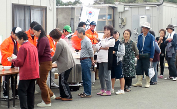 「国籍や国境に支援の壁があってはならない」が同会の信条。「前回は生きたくても行けなかった」という在日青年商工人も家族同伴で加わり、総勢17人が2班に分かれて集会所など7カ所を回った。2日目は冷たい雨だったのにもかかわらず、多くの住民がかき揚げと山菜の入った熱々のお蕎麦を求めて順番待ちの行列をつくった。