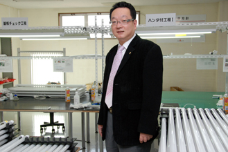 3種類のサイズ(20㍗・40㍗・110㍗型)を備えたLED蛍光灯シリーズを生産中だ。「使用可能時間は4万時間。これからはLEDの時代で、需要はますます拡大するだろう」。社員は10人、10年度売上額は約3億6000万円。