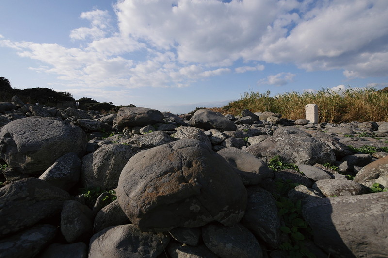 次の渡船まで、わずか1時間しかなかったので、早足で現地に向かった。山道から脇道へ曲がると長井浜が眼下に広がる。大小のゴツゴツとした石ころが数百メートル敷かれ、こんもり盛られた積石が古墳だと直ぐに分かった。