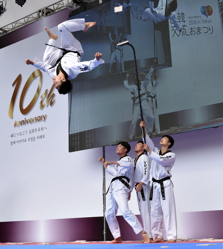 2部の日韓交流ステージは、韓国の第1軍野戦司令部テコンド演武団による高さ4㍍を超える「ジャンピング板割り」、国士館大学空手道部の空手演武で始まった。