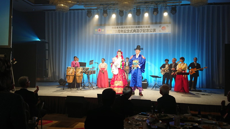第2部の韓国伝統文化祝賀公演では婦人会広島本部がコーラス、テグム、三面太鼓、カヤグム、サムルノリなどを演じた。「土曜学校」のオリニたちもテコンドと舞踊。権五源同本部常任顧問は韓・日・米の曲で自慢ののどを披露し、「民団70周年記念スペシャルバンド」が韓日の歌と演奏で締めくくった。
