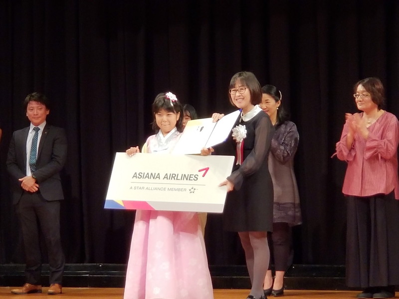 午前中、県内の各韓国学園で学ぶ学生たちによる韓国語スピーチ大会は初級と上級に分かれて行われた。審査の結果、初級は安田愛菜さん(神戸オリニ土曜学校)、上級は小川沙織さん(兵庫韓国学園)がそれぞれ大賞を受賞した。