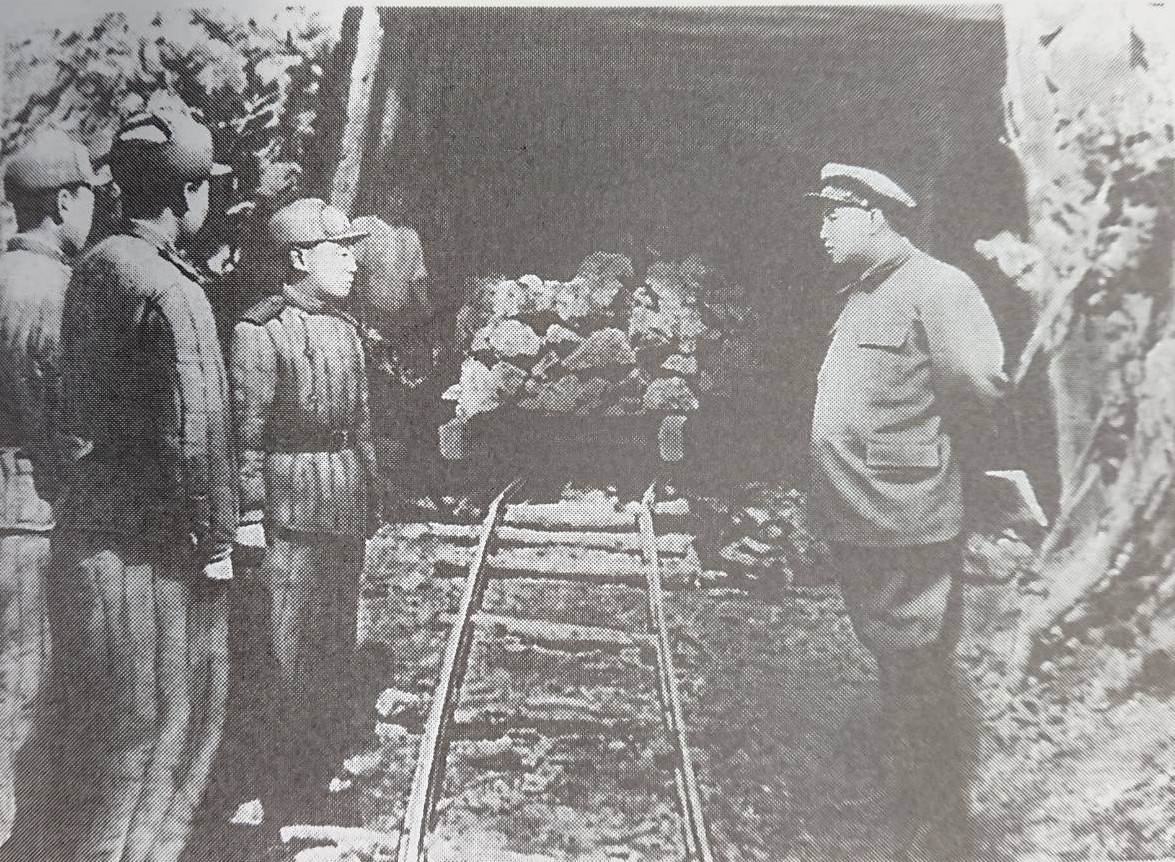 [ 朝鮮高級学校で使用されている教科書「現代朝鮮歴史 高級1」に掲載されている写真「坑道陣地掘設作業現場を現地指導される金日成主席」 ]