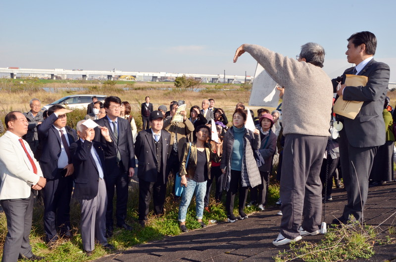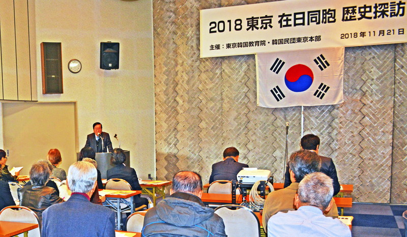 在日韓国人の足跡を訪ねて歩く第2回フィールドワークが11月21日、東京都内で行われた。民団東京本部(金秀吉団長)が東京韓国教育院(兪皓善院長)と共催した。民団と婦人会の関係者60人が参加。まず東京韓国YMCAで開会式を行い、来年100周年を迎える2・8独立宣言について、梁東準・元神奈川大学客員教授の講演を聞いた。この後、バスに分乗し、1923年の関東大震災時に虐殺のあった墨田区の荒川河川敷を訪ねた。36年間、追悼行事に関わっている西崎雅夫さん(一般社団法人ほうせんか理事)が案内役を務めた。西崎さんは「95年前の惨劇でも、遺族にとってはまだ終わっていない。過ちを繰り返させないためにあきらめず語り続けていく」と決意を述べた。