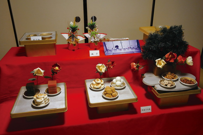 [ 復元された御菓子9種に御銚子(奥)など ]