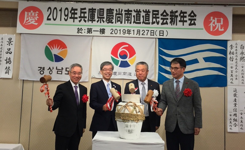 新年を祝う鏡割りには駐神戸総領事館の朴起準総領事、南海郡の張忠男群守も加わった。李会長には慶尚南道道議会からの感謝状が贈られた。