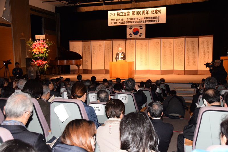 在日韓国留学生連合会の朴淳圭会長が2・8独立宣言を朗読した後、3・1運動及び大韓民国臨時政府樹立100周年記念事業推進委員会の韓完相委員長が「今、私たちに必要なのは南北の和解と平和を通じて世界平和を成し遂げようという2・8独立宣言の精神である」と今日的意義を力説し、李洙勲駐日大使は「韓日の人的交流が昨年史上初めて1000万人を超えた。韓日関係の揺るぎない土台となる人的文化交流をさらに拡大させよう」と呼びかけた。