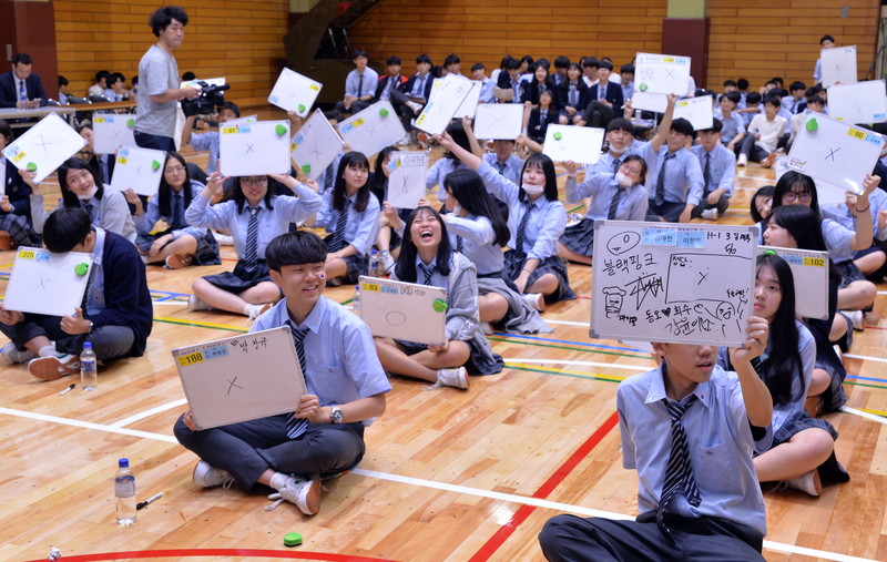 今年は在学中の高校1、2年生240人が参加した。まず○×問題で正解者が勝ち残る形式で順に14人に絞り込み、この後、○×問題に加えて、記述問題で5人が決勝に進出した。