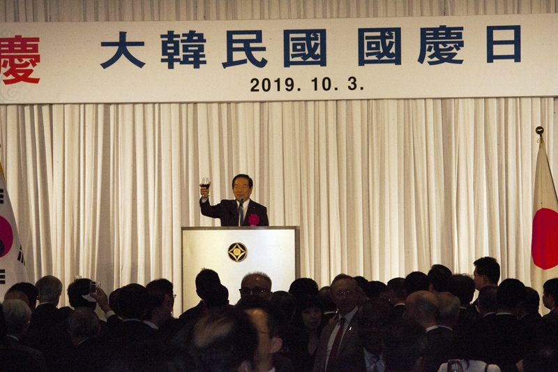 駐日韓国大使館は3日、東京都内のホテルで国軍の日・開天節を祝う「国慶日」レセプションを開いた。日本側から河野太郎防衛相、額賀福志郎日韓議員連盟会長をはじめとする議員ら日本の政界関係者や各国外交官ら約1000人が参加した。