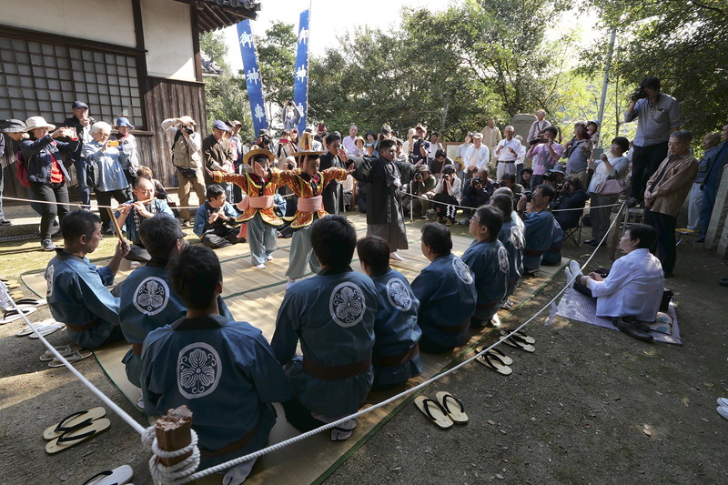 そのあと薬師堂、神功皇后腰掛岩へと移動してゴザの上での「唐子踊」が披露される。
