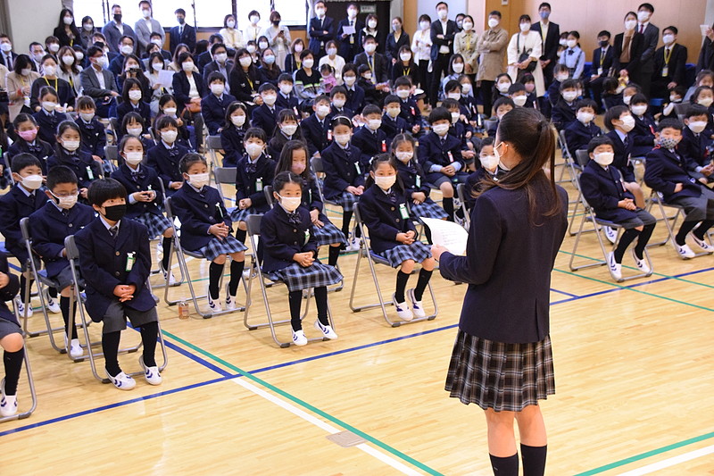[ 新1年生に歓迎のことばを述べる初等部学生会長 ]