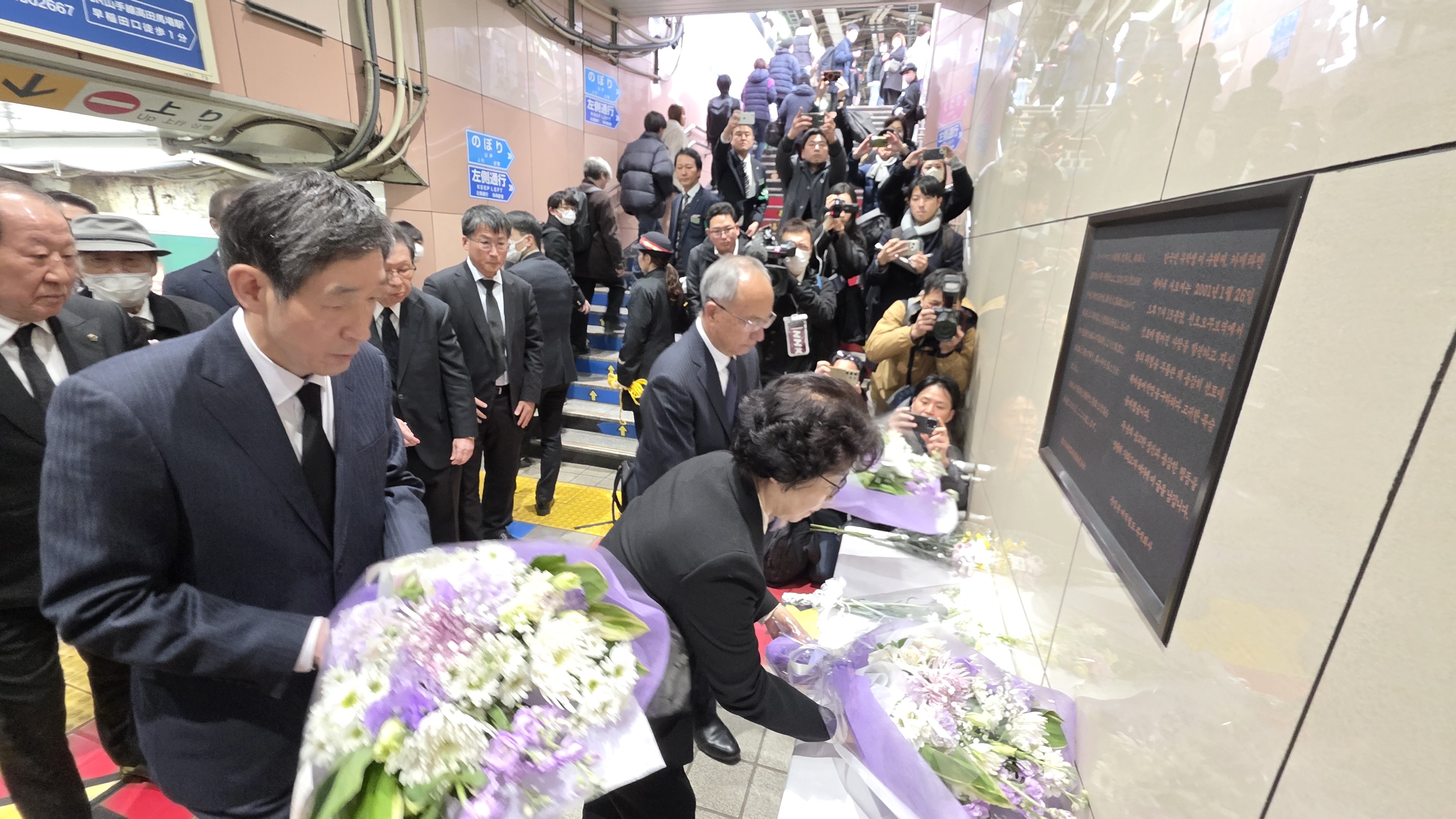 2001年1月26日、東京のJR新大久保駅で、誤ってホームに転落した男性を救出しようとした韓国人留学生、李秀賢さん(当時26歳)が、電車にはねられて亡くなった事故から25年を迎え、追悼式(主催・新宿韓国商人連合会)が1月26日、新大久保駅構内で行われ、母親の辛潤賛さん、李赫駐日大使らが参列し、駅構内の顕彰碑に献花した。
