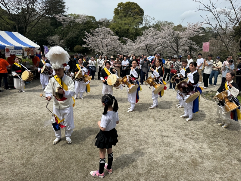 民族音楽院によるコムンゴとサムルノリの演奏が始まると庭園内に人垣ができ、多くの見物客の手拍子に包まれ躍動するリズムを刻んだ。同院の李昌燮代表理事は「韓日交流を通じて役割を果たせた」と話した。