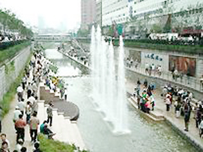 清渓川の始発点は、光化門近くの清渓広場。風変わりなポジャギ(伝統ふろしき)形広場にある噴水から滝へと、1日約6万㌧の水量が流れる。22のさまざまなデザインの橋がかかる中で最大の橋が広通橋(略称・広橋)。かつて王家や使臣の行列が往来した重要な通路であった。