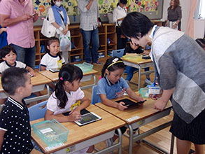 韓国語はipadを使っての模擬授業。子どもたちは興味深げに操作を楽しんでいた。