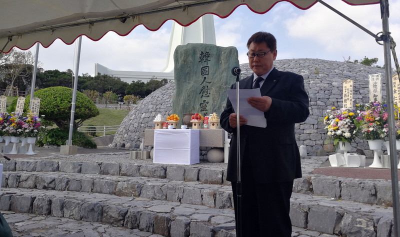 主催者を代表して民団沖縄本部の金仁洙団長が、「悲惨な戦争を二度と繰り返さないためにも、この慰霊祭を継続していく」と述べ、韓半島の平和と安定、韓日関係の改善を祈った。引き続き参列者約100人が献花、焼香し犠牲者の冥福を祈った。