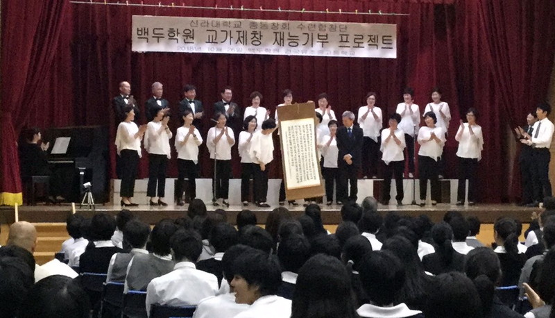新羅大総同窓会の合唱団が建国で公演…「総合学習の時間」として