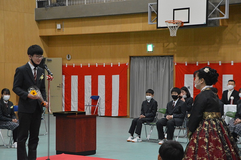 在校生のなかから金大翔さんが送辞を述べ、卒業生を代表して郭東民さんが自分たちを育ててくれたすべての人に感謝の気持ちを伝えた。