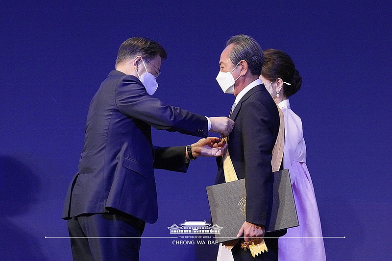 [ 文在寅大統領から「無窮花章」を受ける崔鐘太氏 ]