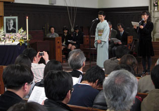 1部の追悼セレモニーでは礼拝、追悼の歌に続き、韓国語と日本語による7編の詩の朗読が行われた。「たやすく書かれた詩」は、尹東柱が立教大学在学中に朝鮮語で5編の詩を書いたなかの1編。英語も交えての朗読に、参加者たちは静かに聞き入っていた。
