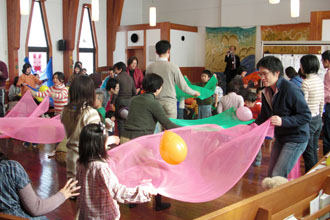 ムーブメントセラピーを取り入れた、子育てワークショップ「家族で楽しいムーブメント〜パパ友つくろう」が15日、神奈川・平塚市の平塚富士見町教会で開かれた。講師は、前平塚市子育て支援センター・チーフアドバイザーの李禮子さんら、チャイルドプラスのメンバー。父母や子どもら80人が参加した。