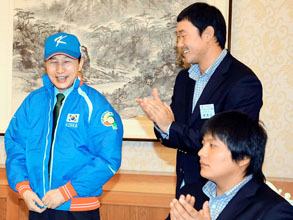 第2回ワールド・ベースボール・クラシック(WBC)で準優勝した韓国代表は3月26日、李明博大統領から青瓦台(大統領府)での昼食会に招かれた。奉重根投手が代表チームの帽子とジャンパーをプレゼントするや、大統領は早速、着用=写真。大統領は「韓国野球が他国と比べて劣悪な条件にある中で、実に良く戦った。皆さんの活躍は経済危機に苦しむ国民に、力を合わせれば困難を克服できるという自信を与えてくれた」とねぎらった。