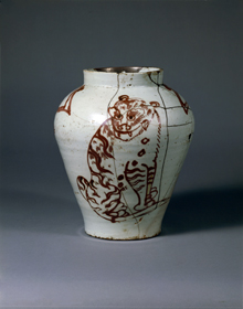 [ 朝鮮時代の「辰砂虎に鵲文壺」 ]