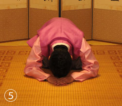 | ①両手の指をきちんと揃え、左手を上にして軽く合わせ(拱手)、相手に向かってまっすぐ立つ。 | ②腰を折り左膝を最初に曲げる。 ③拱手した手を床につけたあと、右膝と左膝をきちんと曲げる。 |