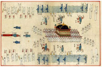 白い服を身にまとった85人の担ぎ手が、国葬で柩を運ぶ際に使う大きな輿をかついでいる。その左右には、青い幕を持ち、輿を隠しながら歩く様子が描かれている。これは、死者が女性のため、一般人に見えないように覆っているのだ。