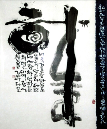 日本、韓国で書を学んだ李さんは、金容浩の詩を題材に、2枚で構成したハングル作品「鎮魂のうた」(対訳作品)と、水墨画の「追憶」を展示する。