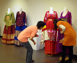 朝鮮王朝時代の宮中衣裳が、このほど大阪韓国文化院(大阪韓国人会館内)で展示された。同院が企画した「韓国・大阪友好週間」を記念しての特別企画展。韓国唯一のポジャギ&キルト博物館「草田繊維・キルト博物館」(金順姫館長、ソウル市)の協力で実現した。