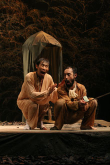 韓国の演出家、李潤澤さんが、静岡県舞台芸術センター(SPAC)の俳優を演出。小さな無人島に流れ着いた韓国人と日本人の男。2人は言葉も通じず、最初は敵対するが、やがて助け合い、理解し、友情を育む物語。